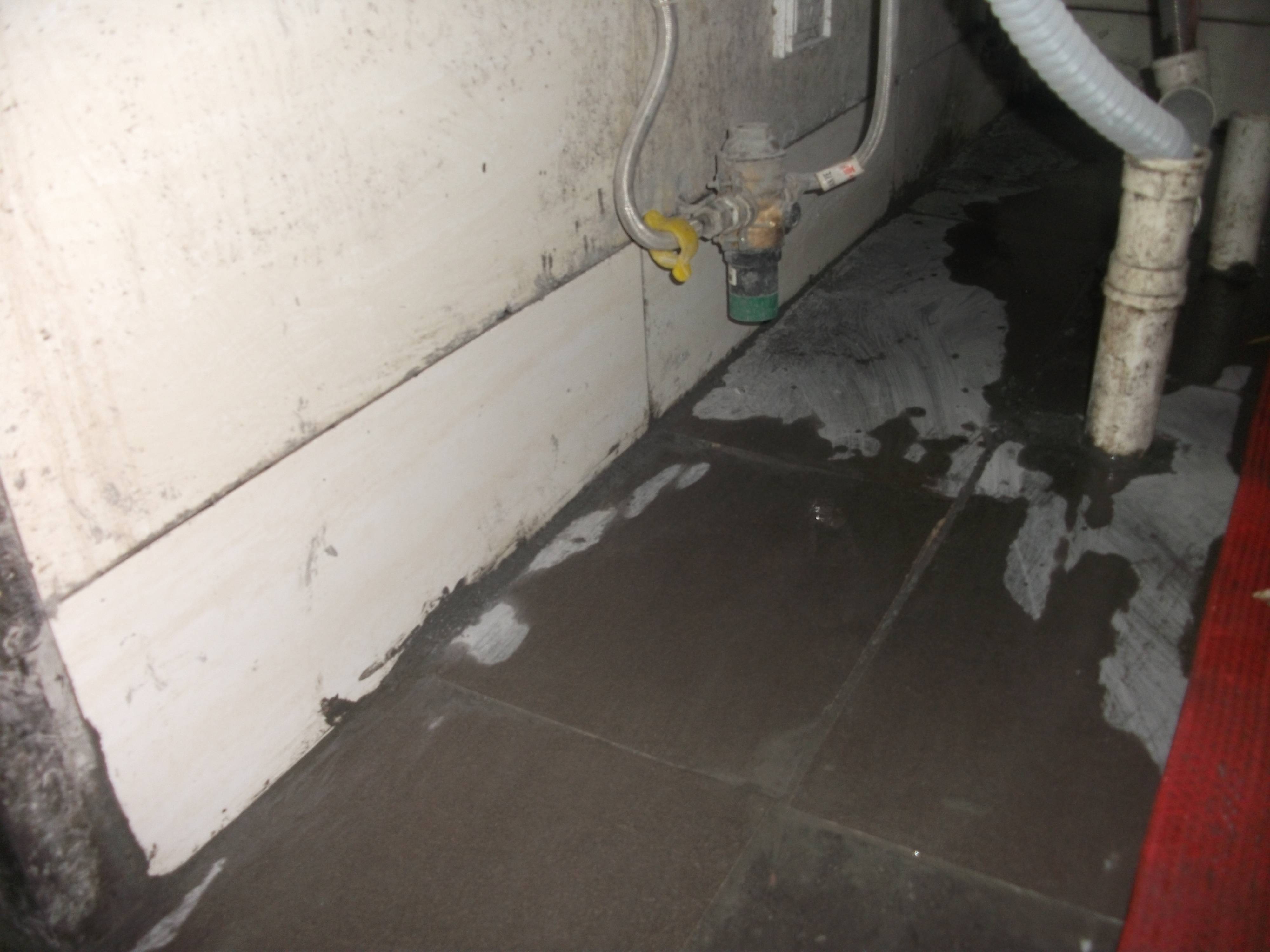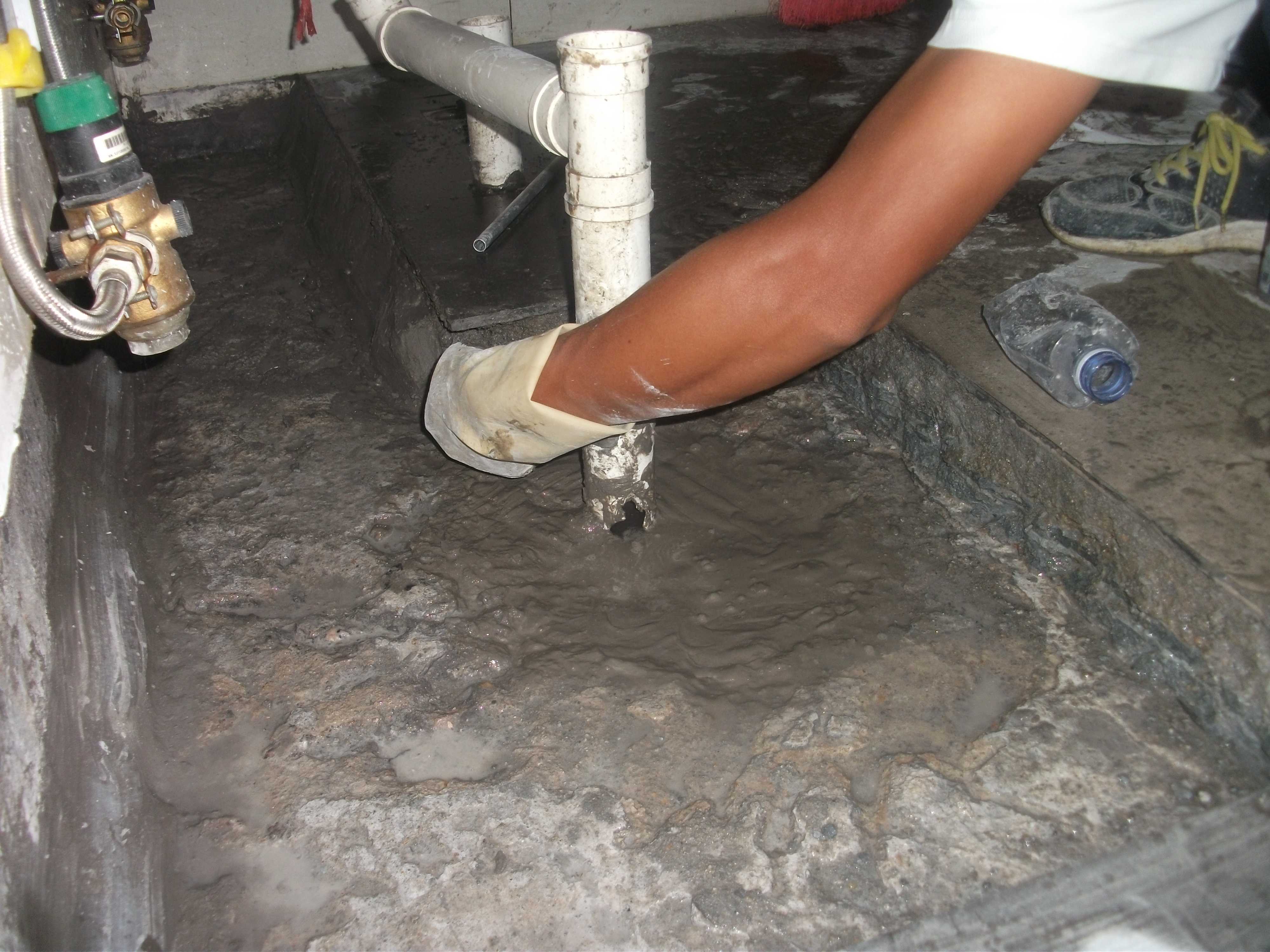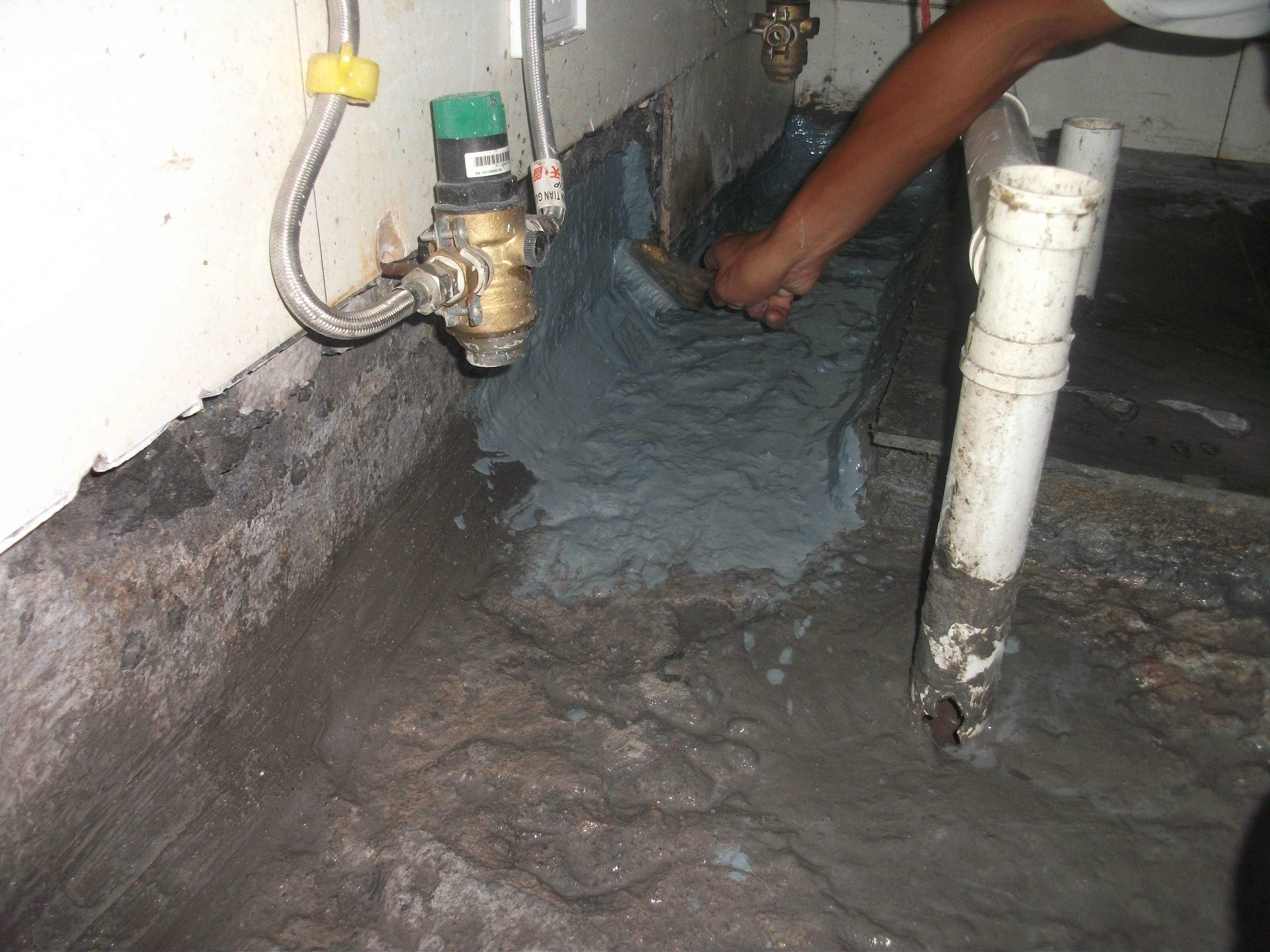 本案例為廣園路二樓大型超市公共衛生間滲水,衛生間位于超市中間,周邊不同情況滲水,樓下無滲漏。根據現場情況,公司給出的防水補漏方案為四周圍依托厚墻體做防水、加高地面存水能力,并利用原衛生間地漏進行排水,堵排接合的防水補漏方案。具體為人工開鑿衛生間四周至原結構面,陰角開“V”形槽,清洗封堵、加強防水層、整體防水層、三途并設二次排水。