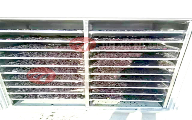 7.桑葚烘干機底部設有雙滑道,烘車裝滿烘盤后,可通過拖輪滑道,運送到烘干機里面,固定底部,