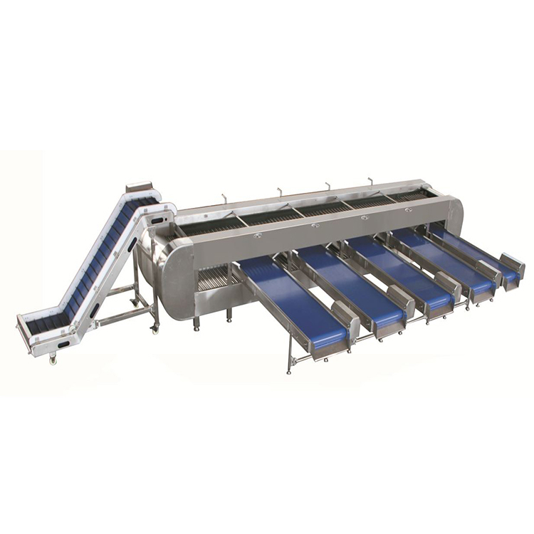 采用滾杠式的網(wǎng)帶互相交替分級,可分為5個級別,該機可按照果蔬的大小直徑進行分級,可分為多個級別,胡蘿卜在進行分級前,分級采用滾杠與滾杠之間的間隙進行分級,胡蘿卜和滾杠之間均有的行走中逐漸拉開距離,管與管之間距離逐漸擴大,所分級的產(chǎn)品由大到小分別漏下去,漏到設(shè)備下面的輸送帶上面,通過輸送帶輸送到筐子里面,分級過程中,不損傷胡蘿卜表皮,精度高,速度快,操作簡單。