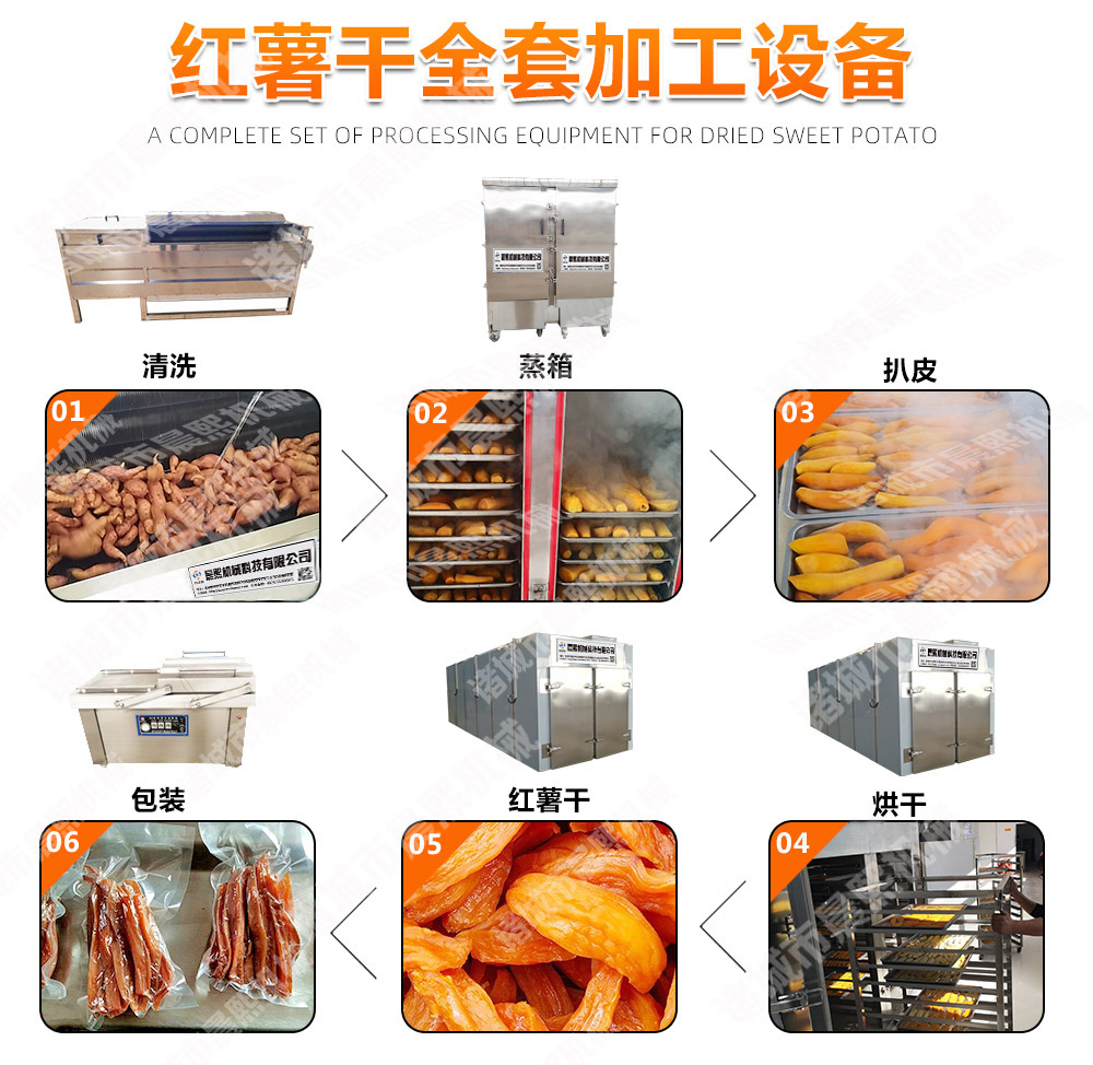 紅薯干加工設備需要設備有:紅薯清洗機,紅薯脫皮清洗機,紅薯蒸箱,紅薯烘干房,紅薯真空包裝機,紅薯拉伸膜包裝機等設備組成